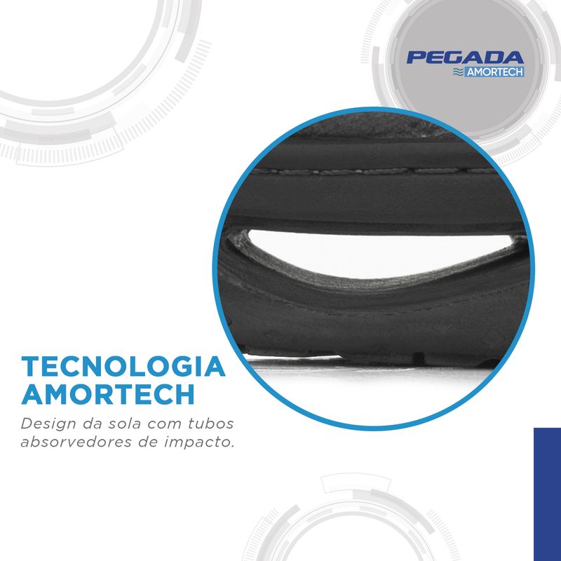 A palmilha é feita em eva macio e confortável. Já o solado é leve e flexível, possui operação de blaque, que confere maior resistência, e ainda conta com a nossa tecnologia de amortecimento AMORTECH, com tubos absorvedores de impacto. O modelo ainda conta com um elástico na parte interna da tira traseira, para facilitar o ajuste ao pé.
